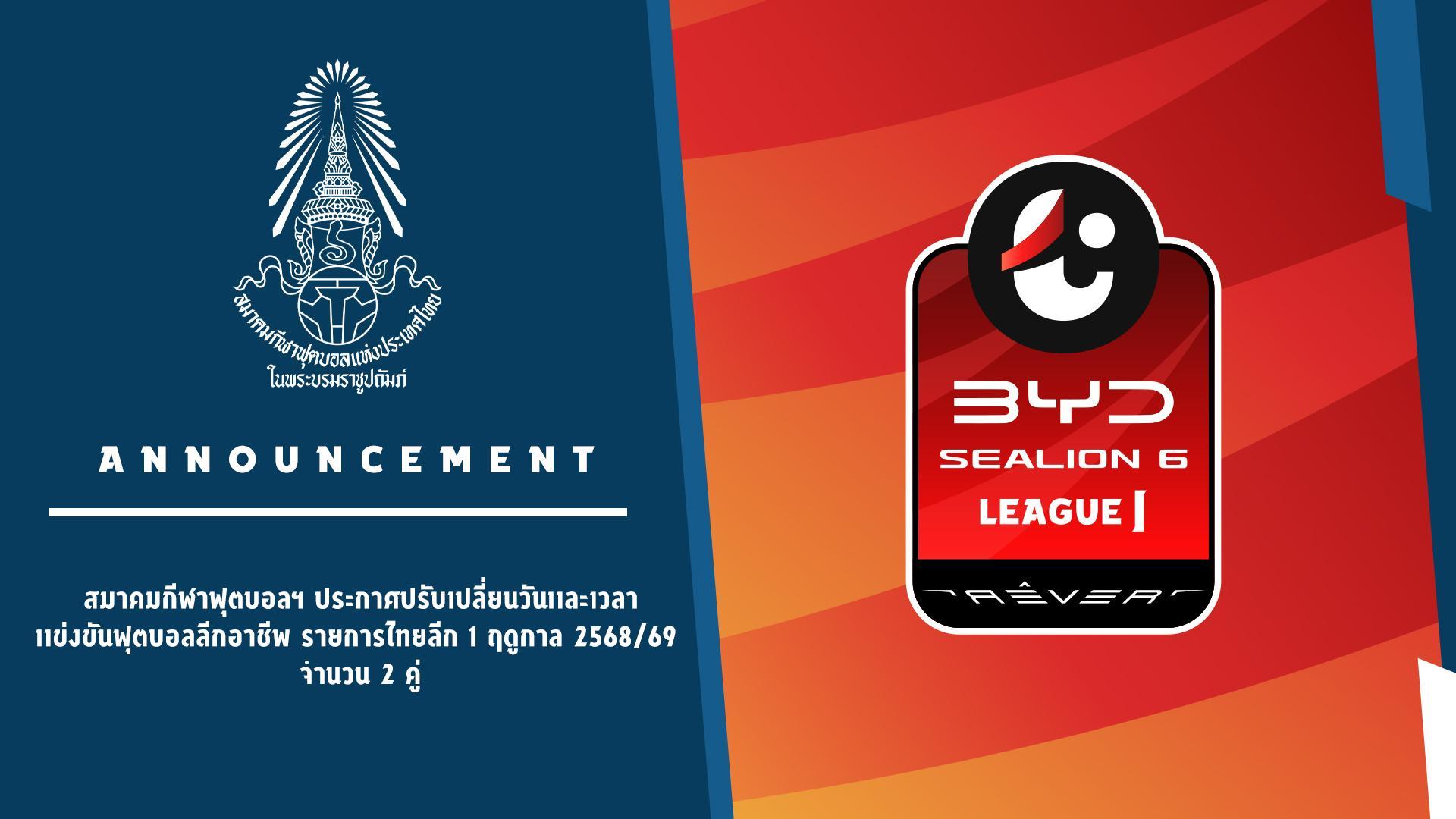 สมาคมกีฬาฟุตบอลแห่งประเทศไทย ในพระบรมราชูปถัมภ์ ประกาศปรับเปลี่ยนวันและเวลาแข่งขันฟุตบอลลีกอาชีพ รายการไทยลีก 1 ฤดูกาล 2568/69 จำนวน 2 คู่