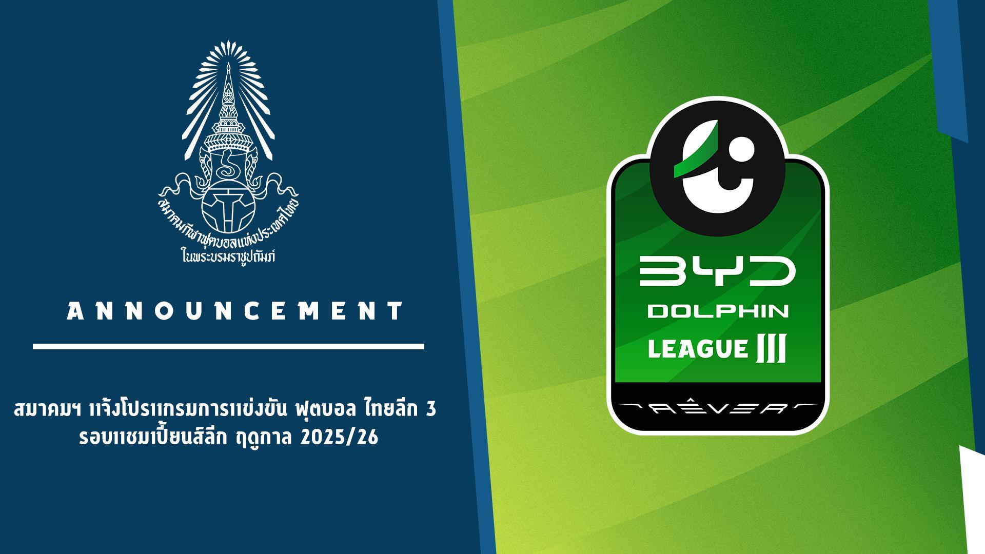 สมาคมกีฬาฟุตบอลแห่งประเทศไทย แจ้งโปรแกรมการแข่งขันฟุตบอลรายการ ไทยลีก 3 รอบแชมเปี้ยน์ลีก ฤดูกาล 2025/26