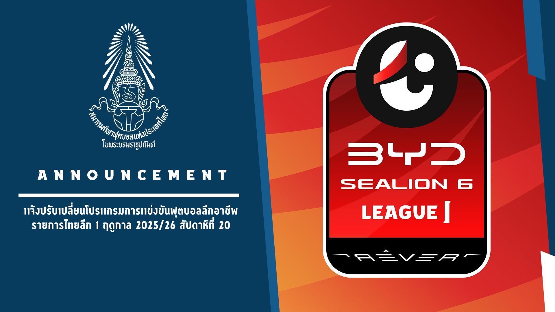 แจ้งปรับเปลี่ยนโปรแกรมการแข่งขันฟุตบอลลีกอาชีพ รายการไทยลีก 1 ฤดูกาล 2025/26 สัปดาห์ที่ 20