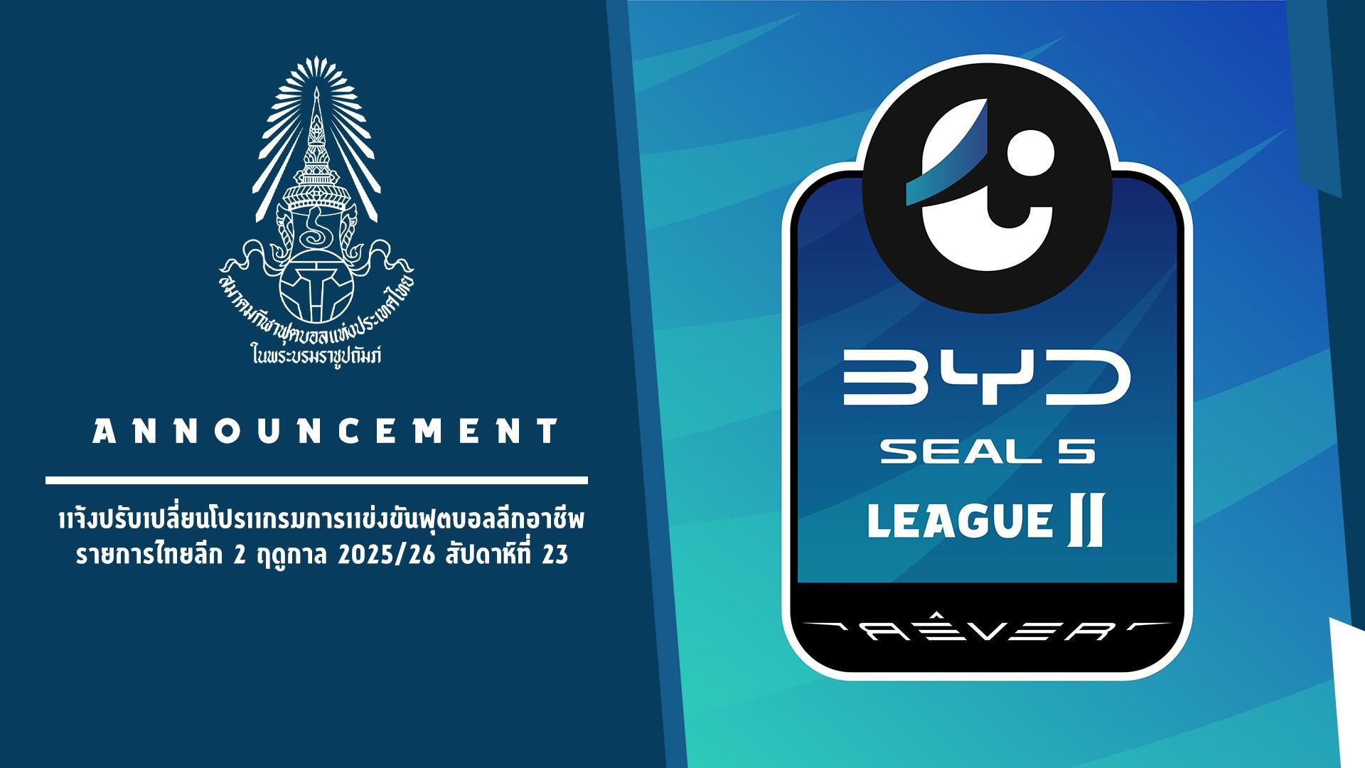 แจ้งปรับเปลี่ยนโปรแกรมการแข่งขันฟุตบอลลีกอาชีพ รายการไทยลีก 2 ฤดูกาล 2025/26 สัปดาห์ที่ 23