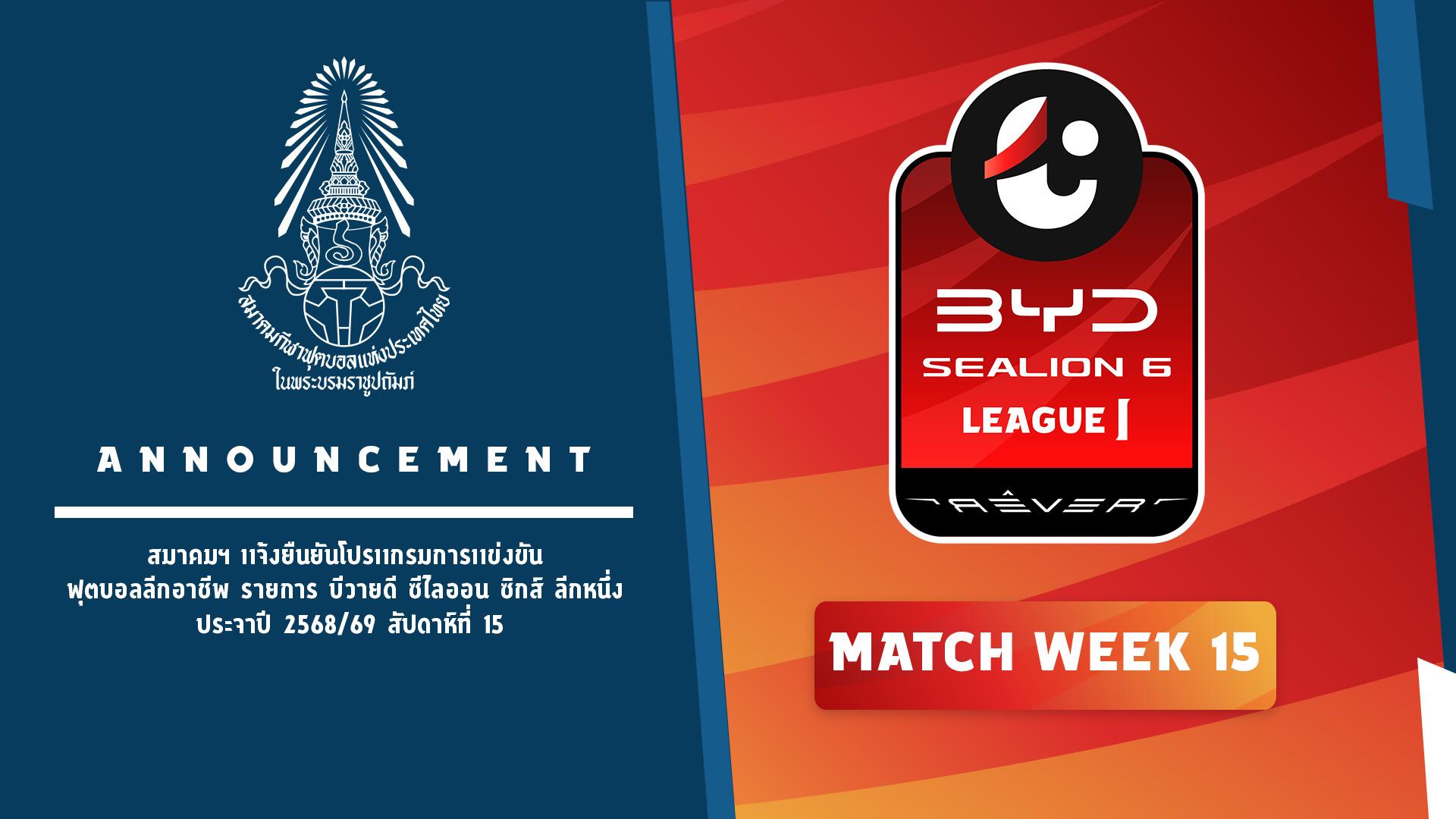 แจ้งยืนยันโปรแกรมการแข่งขัน ฟุตบอลลีกอาชีพ รายการ บีวายดี ซีไลออน ซิกส์ ลีกหนึ่ง ประจำปี 2568/69 สัปดาห์ที่ 15
