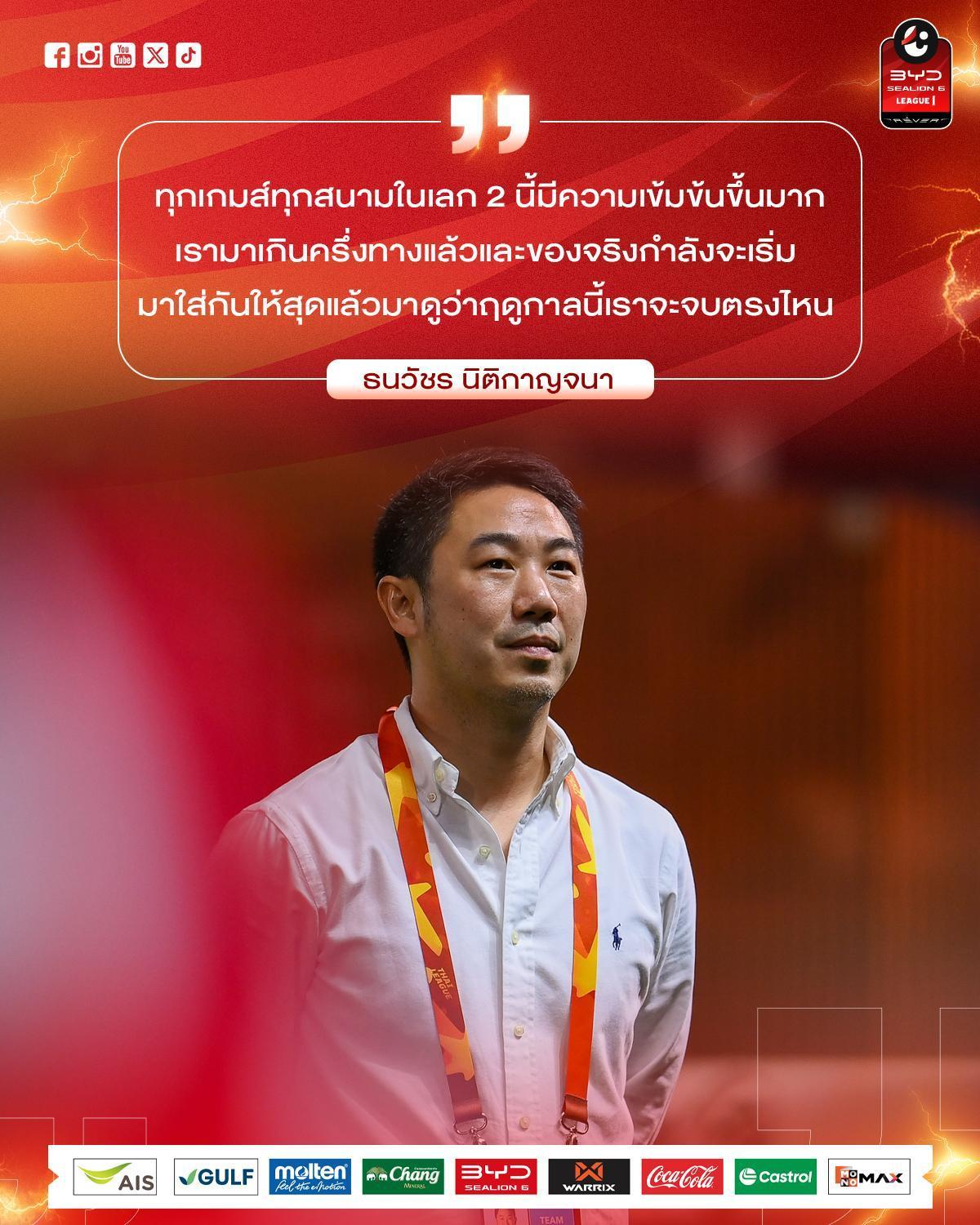 ธนวัชร นิติกาญจนา ประธานสโมสร Ratchaburi FC เผยการแข่งขันในเลกที่ 2 มีความเข้มข้นขึ้นมาก เพราะ 16 ทีม บีวายดี ซีไลออน ซิกส์ ลีกหนึ่ง 2025/26 ต่างต้องการเก็บคะแนนเพื่อทำอันดับให้ดีที่สุด และยังไม่สามารถบอกได้ใครจะจบท๊อป 4 หรือใครจะตกชั้น และต้องการกำลังใจจากแฟนบอล "ราชันมังกร" เพื่อลุยให้เต็มสูบในครึ่งฤดูกาลหลัง